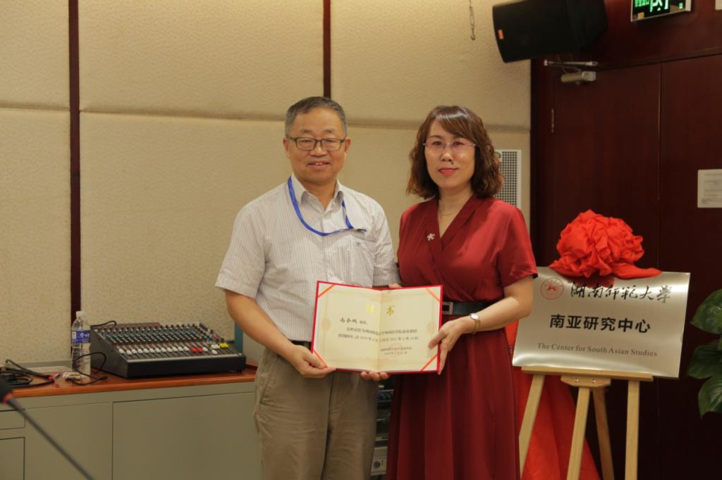 会议首先举行了湖南师范大学南亚研究中心成立仪式,尚会鹏教授赠书予南亚研究中心以庆祝其成立。并被湖南师范大学外国语学院聘为客座教授,由曾艳钰院长颁发荣誉证书。